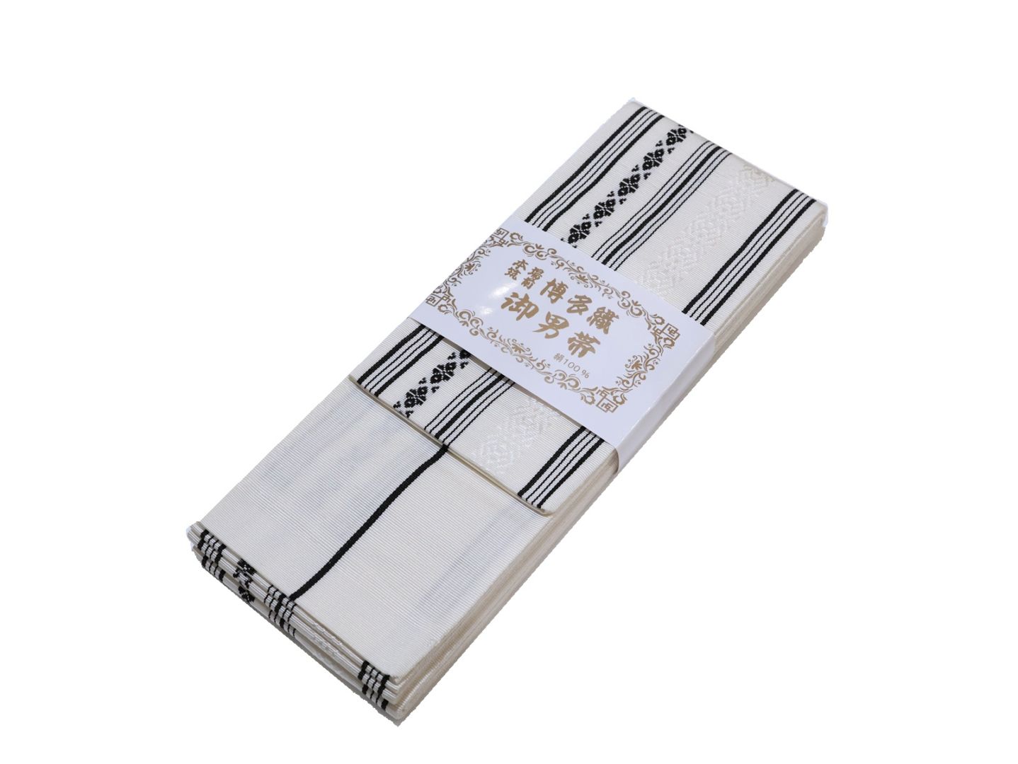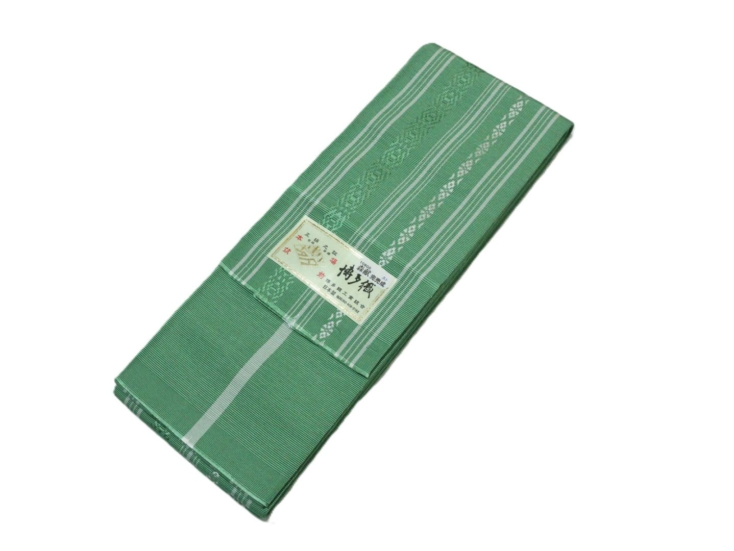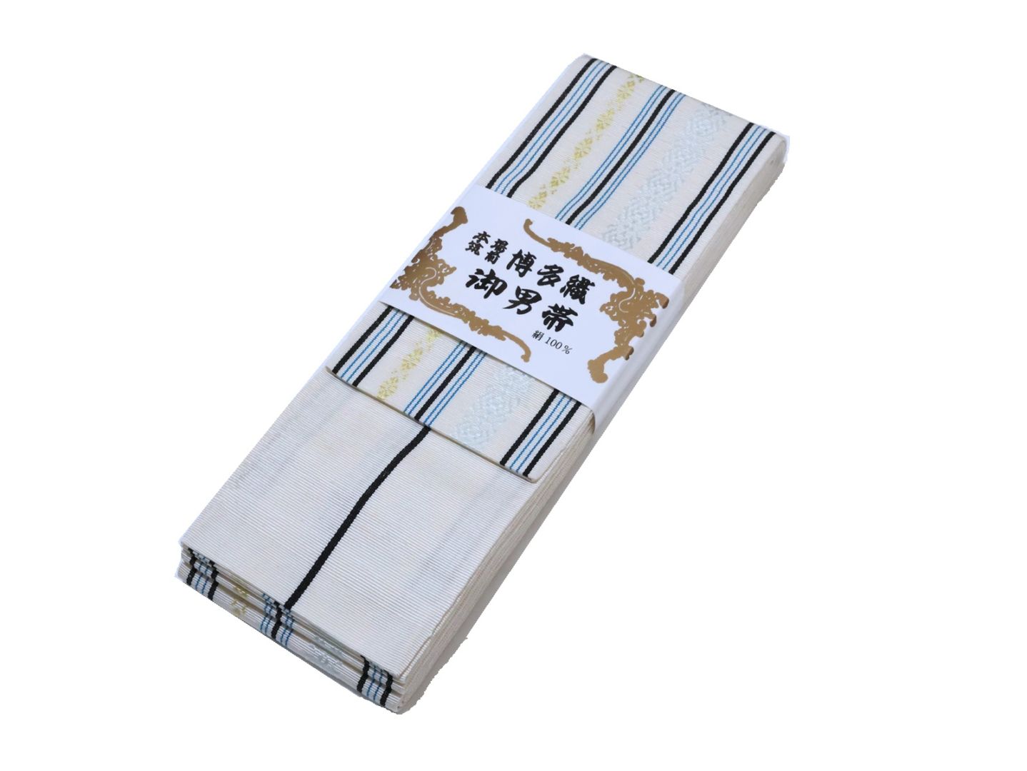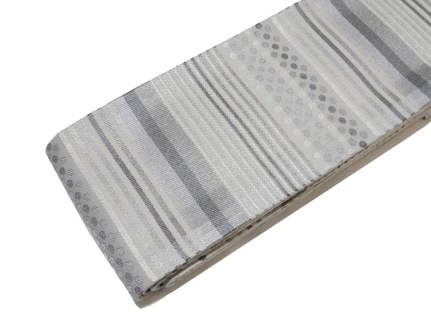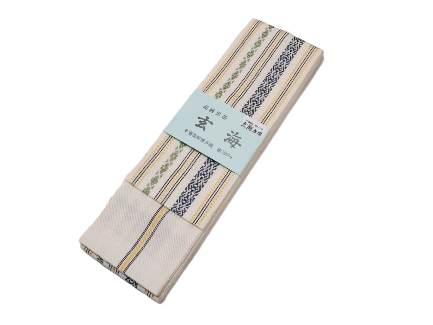 ポリエステル角帯「アイボリー色の地に青緑色や黄緑色、金茶色の縞」