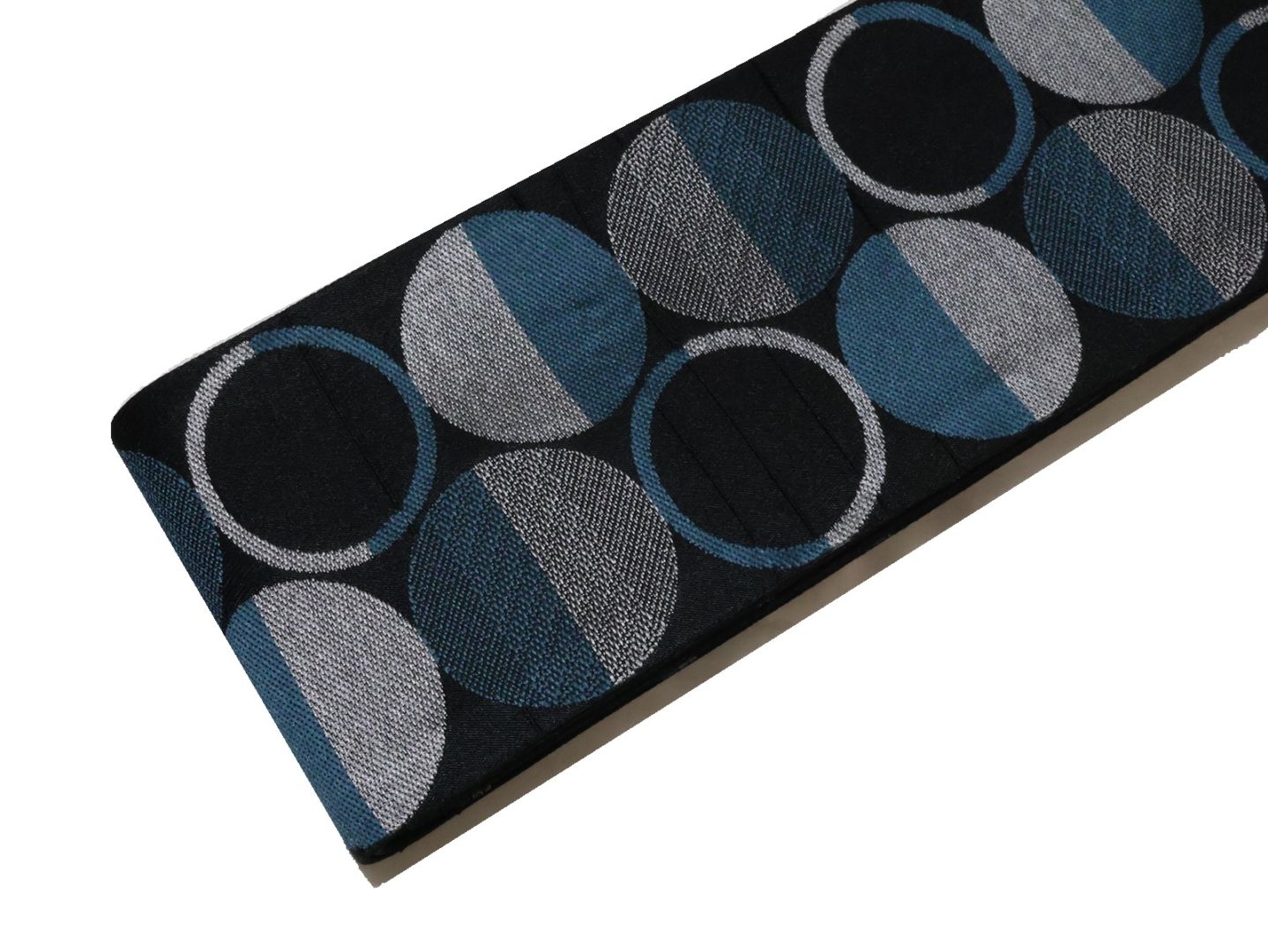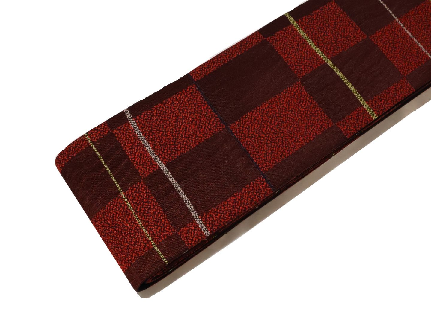 ポリエステル角帯「黒色の地に赤ピンク色と紺色、グレー色の模様」