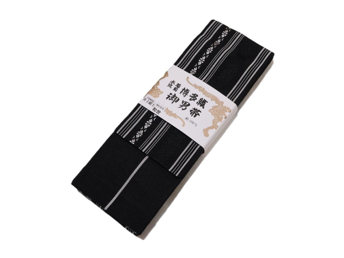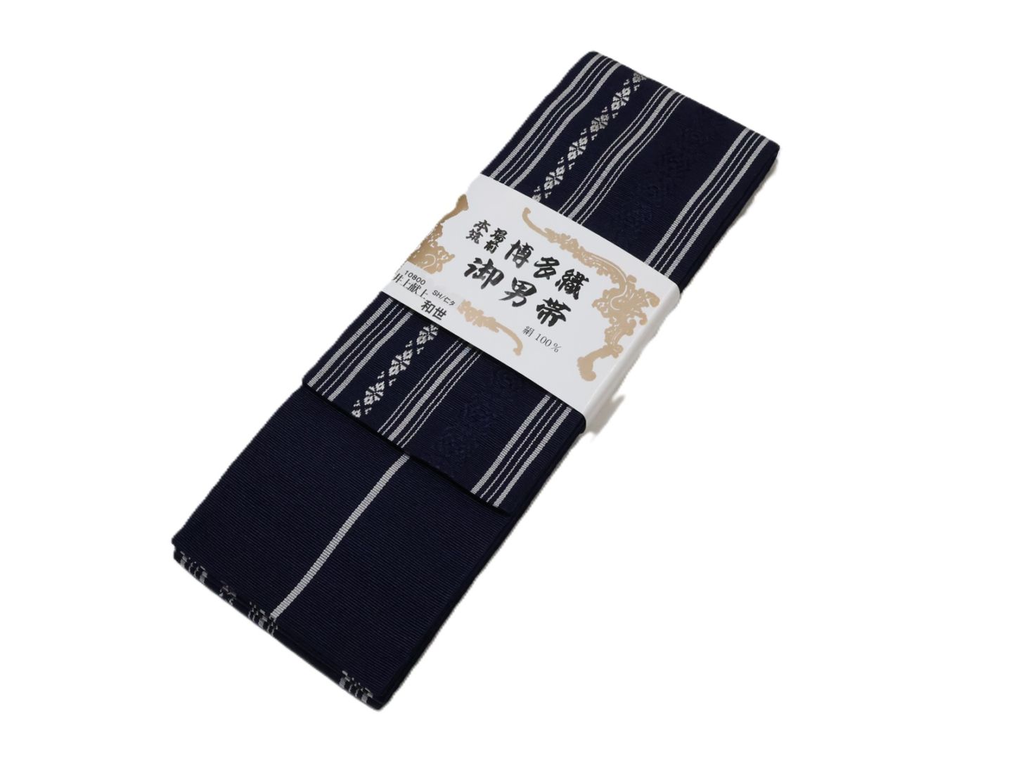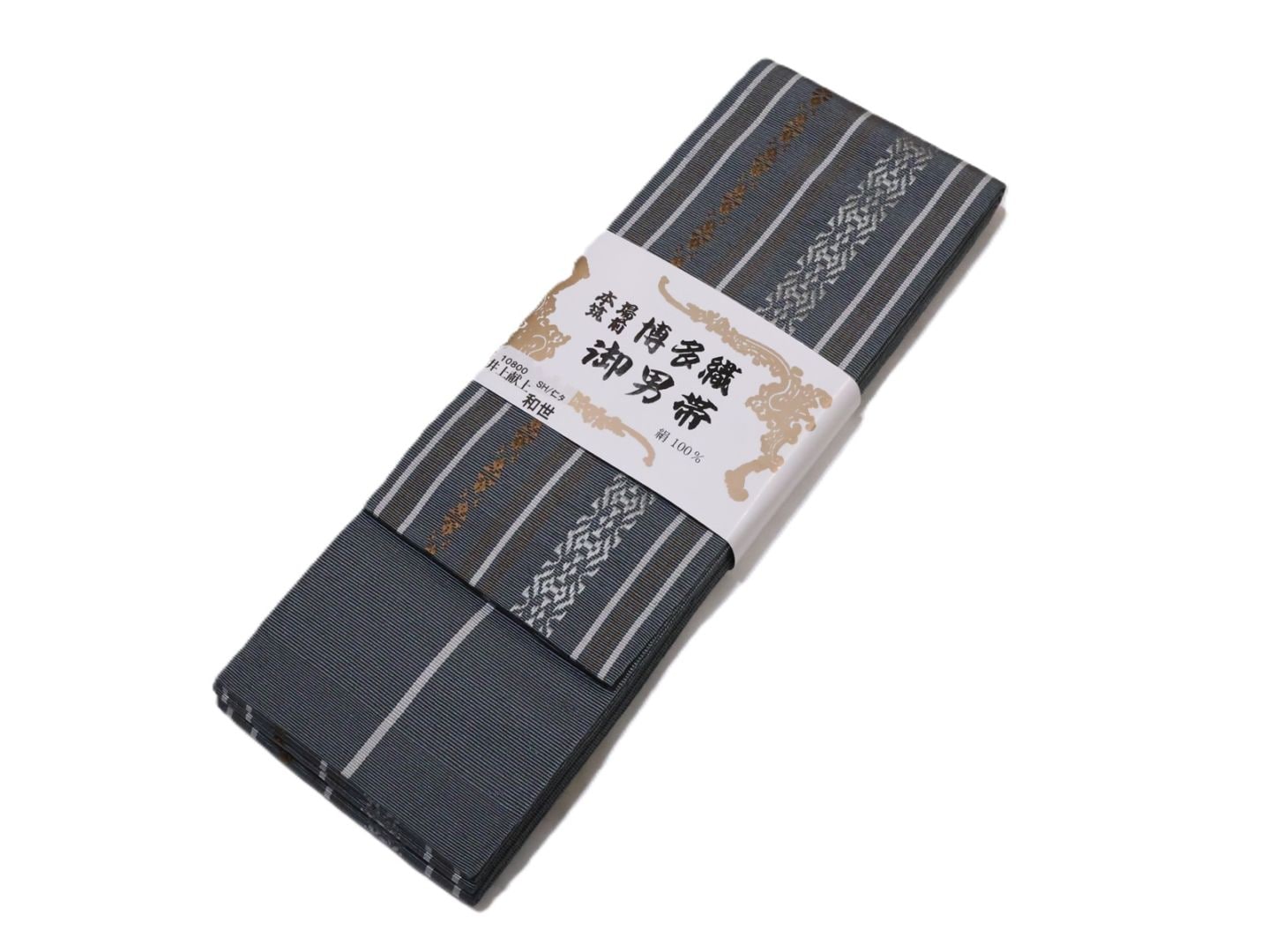 正絹博多織角帯「紺色の地にブルーグレーや濃いグレー色の唐草と縞模様」