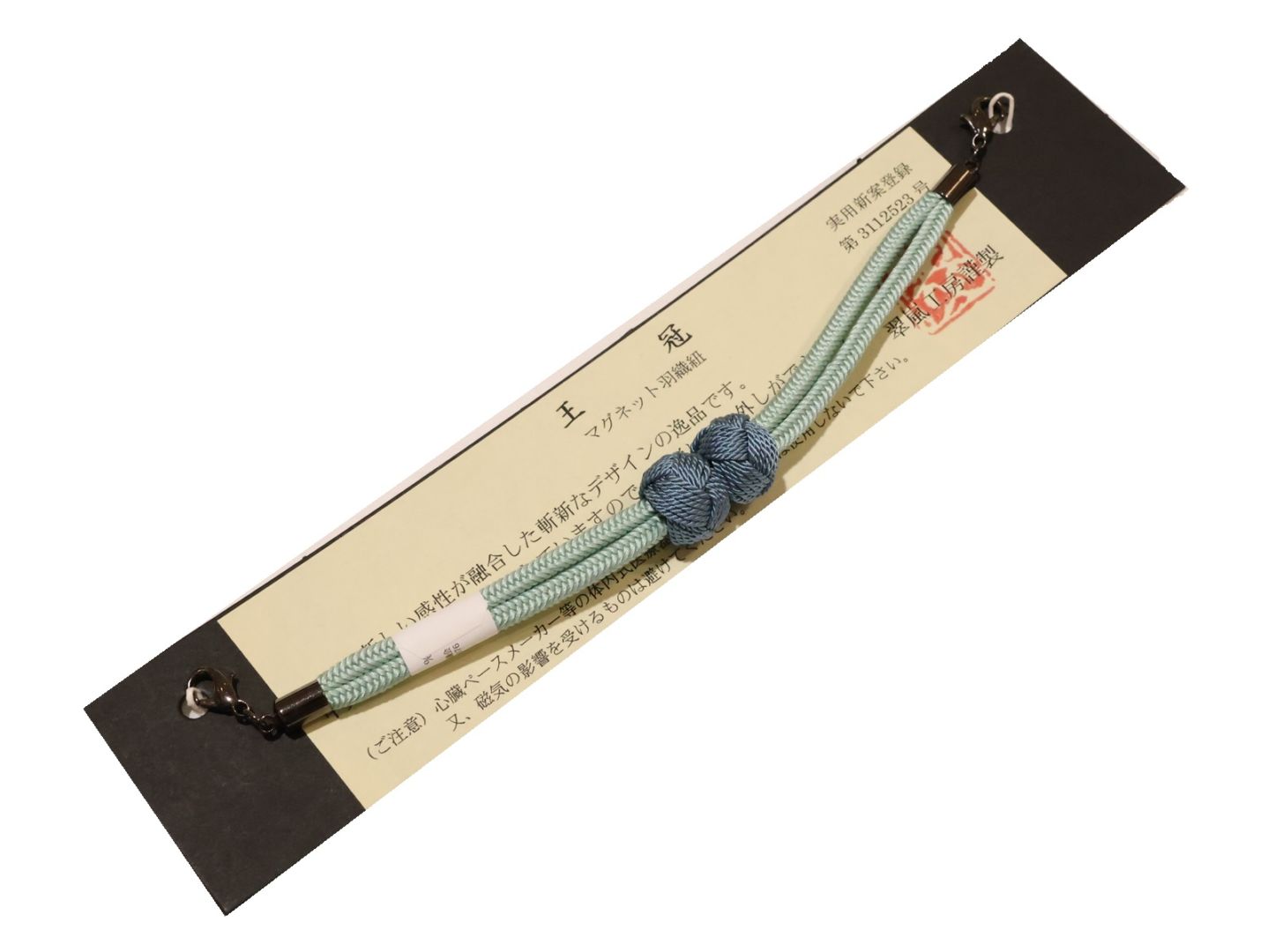 マグネットタイプ羽織紐「薄抹茶色の組み紐に抹茶色(白色の縁取り)の小田巻」