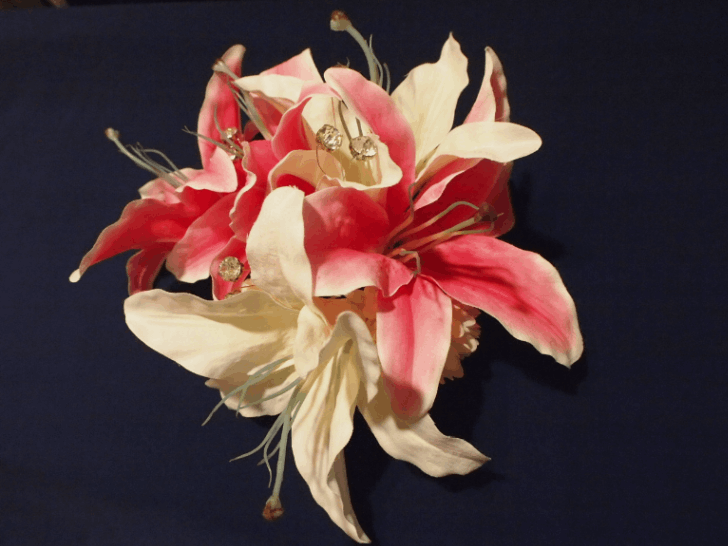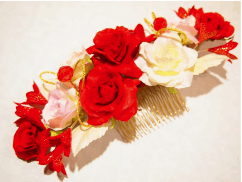 エンジ色と黒色のレース地のリボンと花の髪飾り(大、小4個セット)
