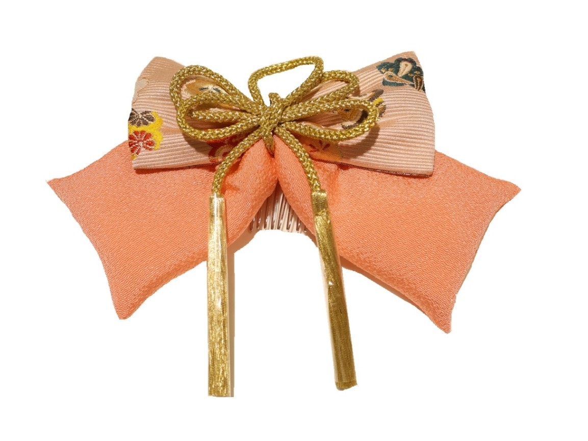 リボン髪飾り「(上)朱色の地に金の飾り紐(下)砂色の地に梅の柄」