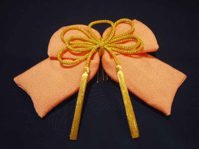 リボン髪飾り「(上)黄色の地に金の飾り紐(下)砂色の地に梅の柄」