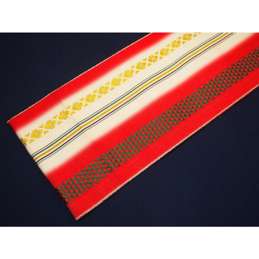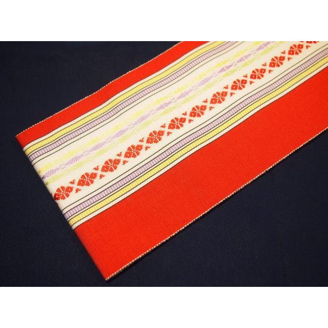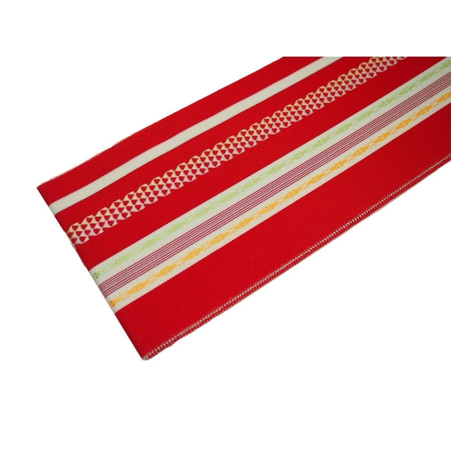 ・長尺正絹博多織伊達締め「赤色の地に黄緑色とオレンジ色の独鈷」