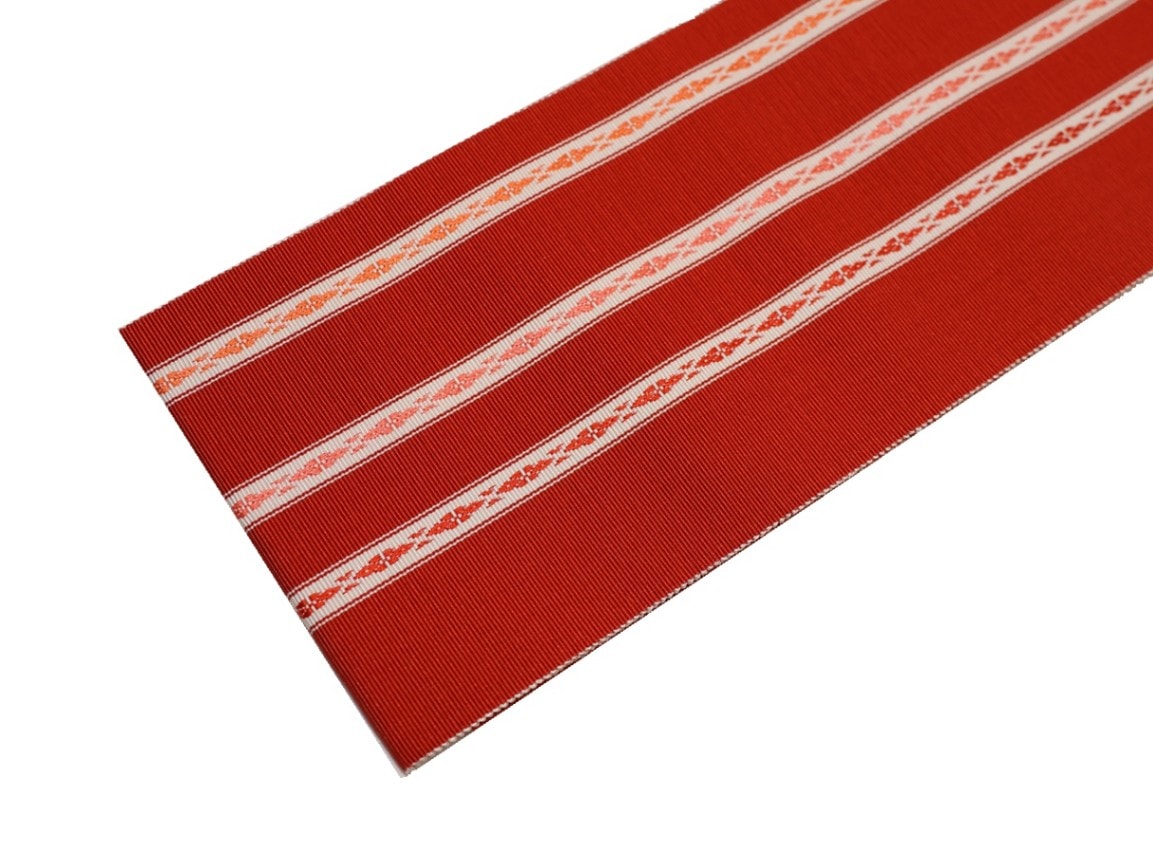 ・長尺正絹博多織伊達締め「赤色の地に赤色、ピンク色、朱色の独鈷模様」