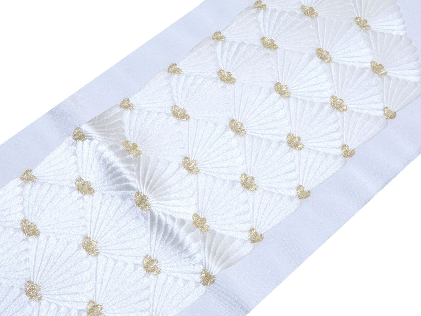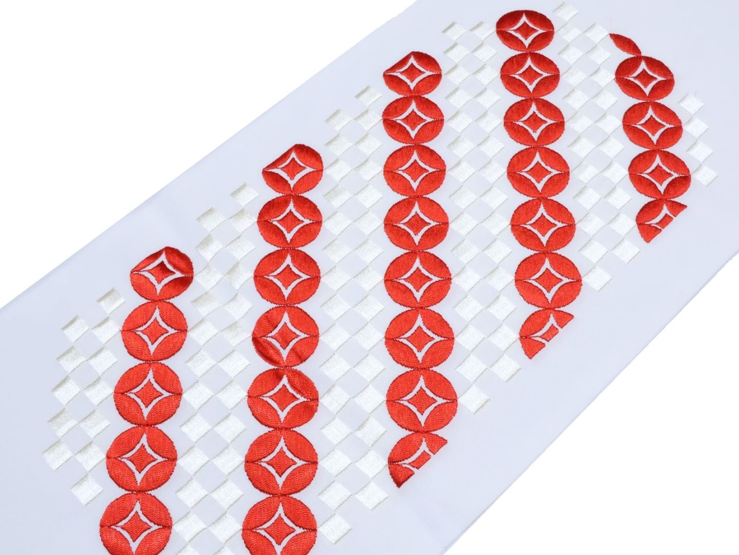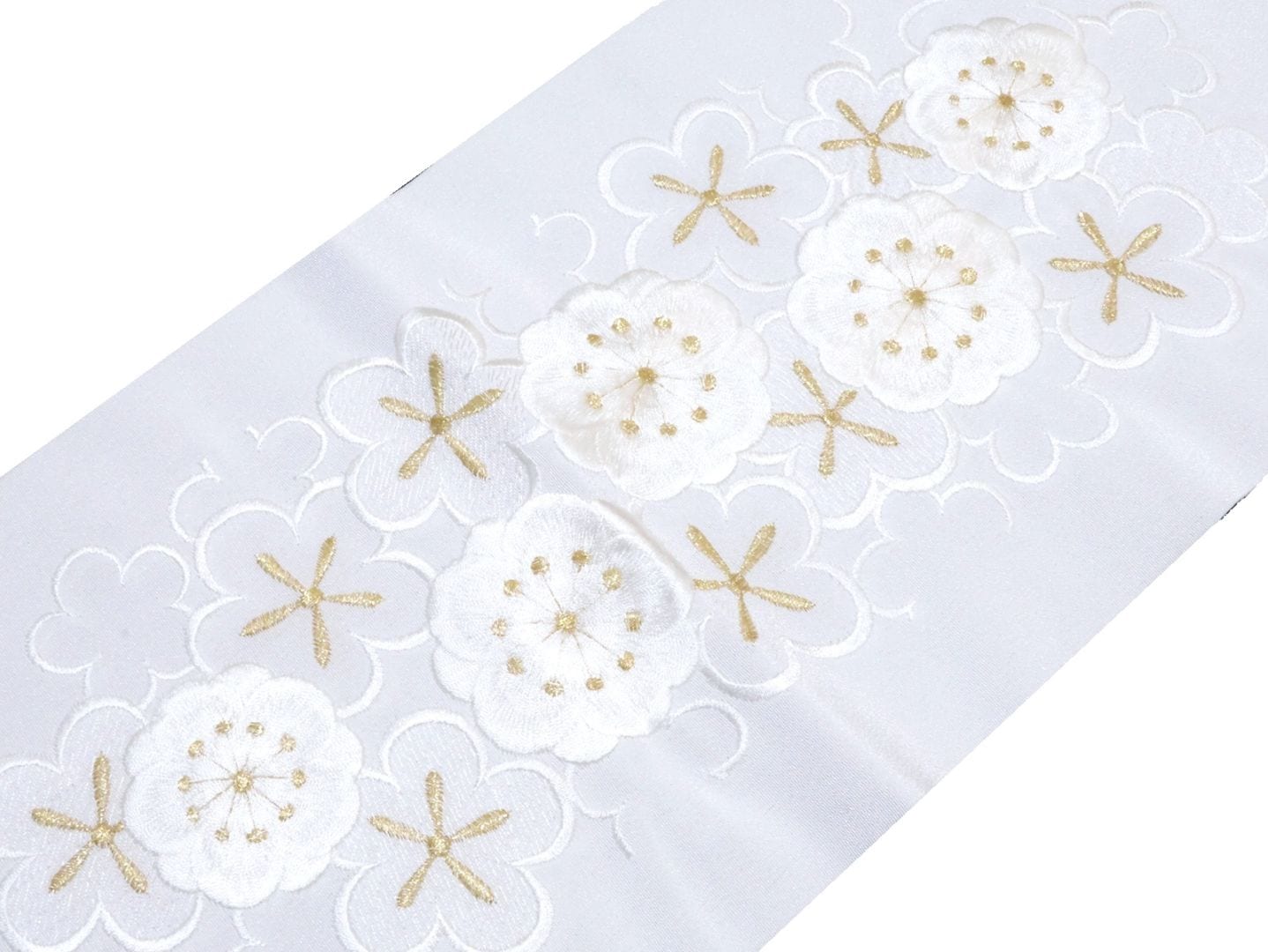 ・刺繍半衿「白色の地に白色、赤色、金色の雪輪青海と梅青海の刺繍」