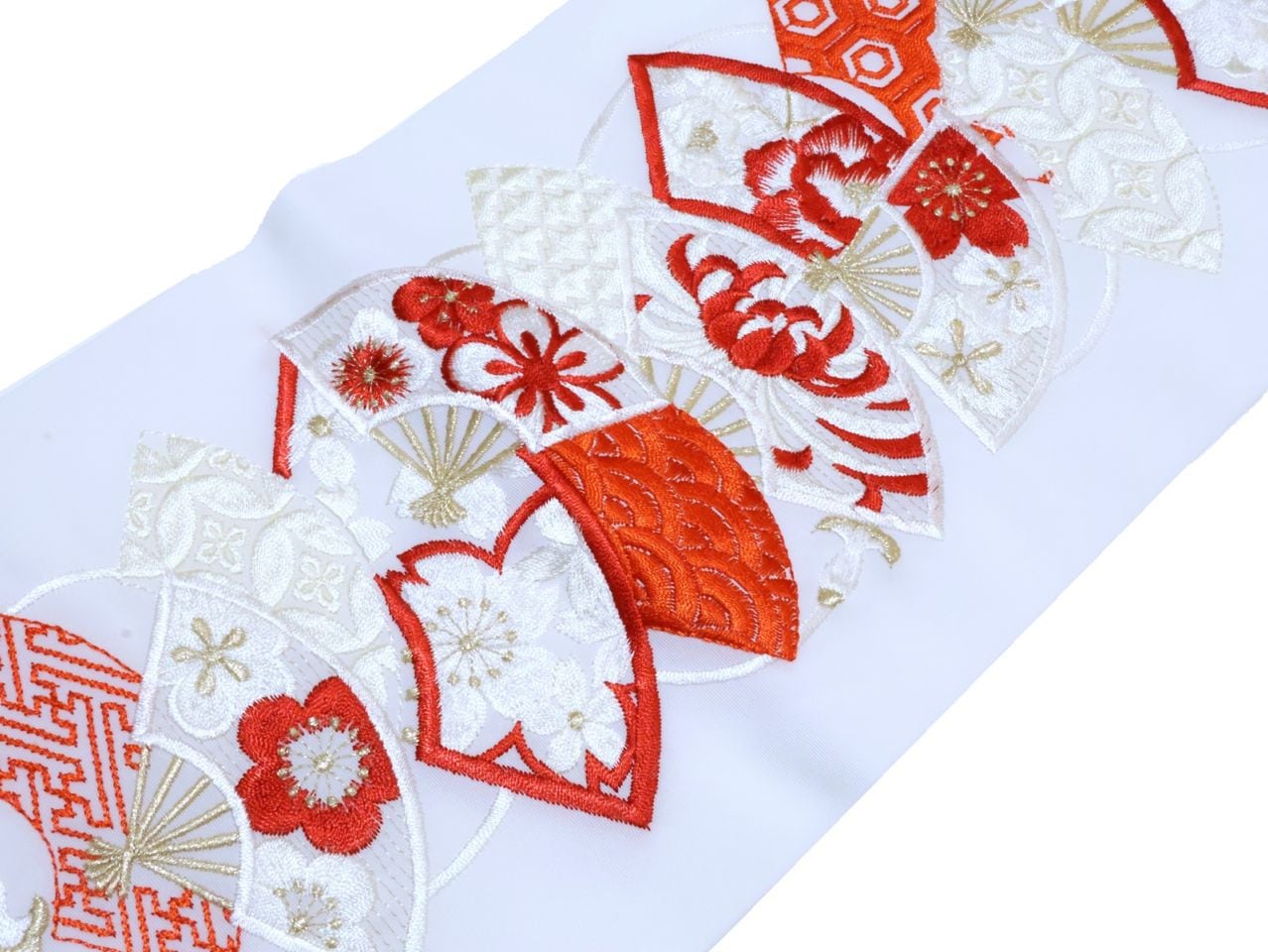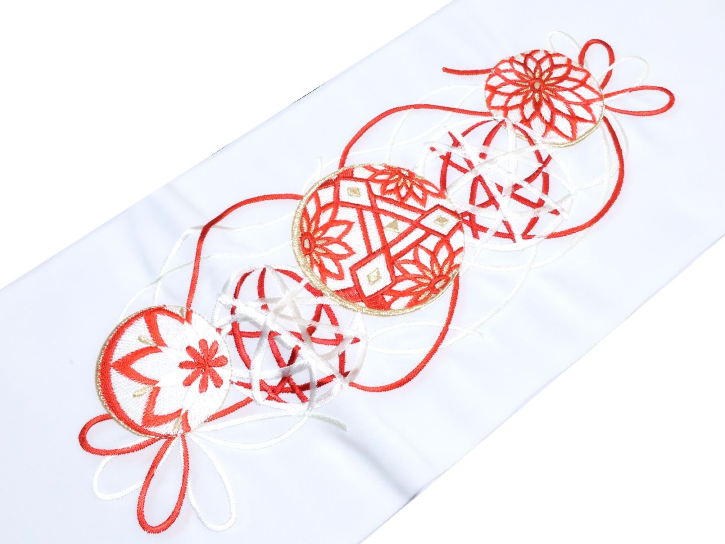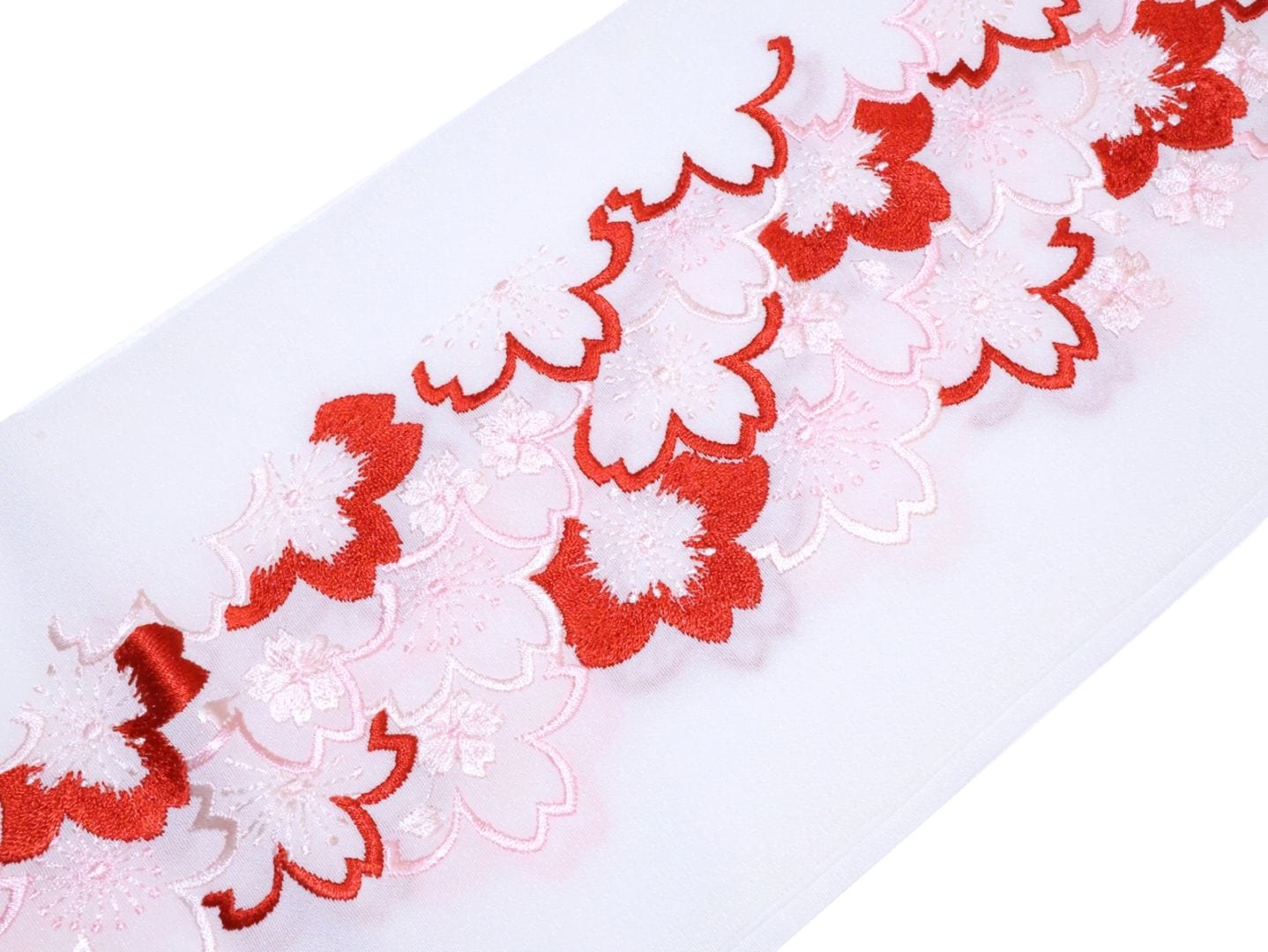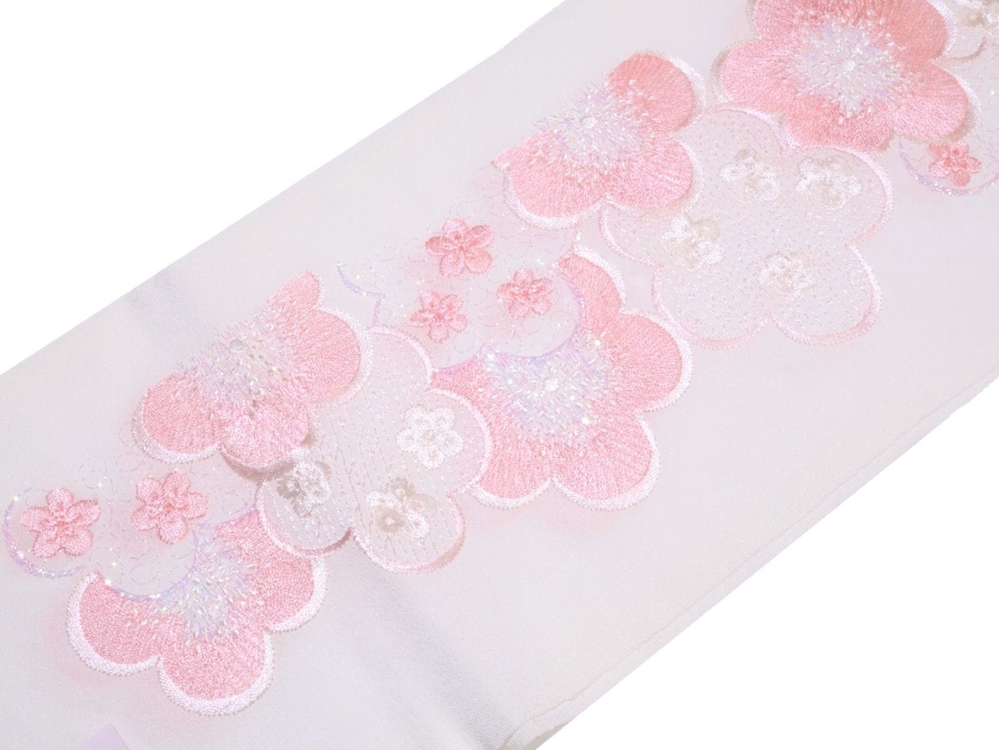 ・刺繍半衿「白色の地に白色、赤色、金色の雪輪青海と梅青海の刺繍」