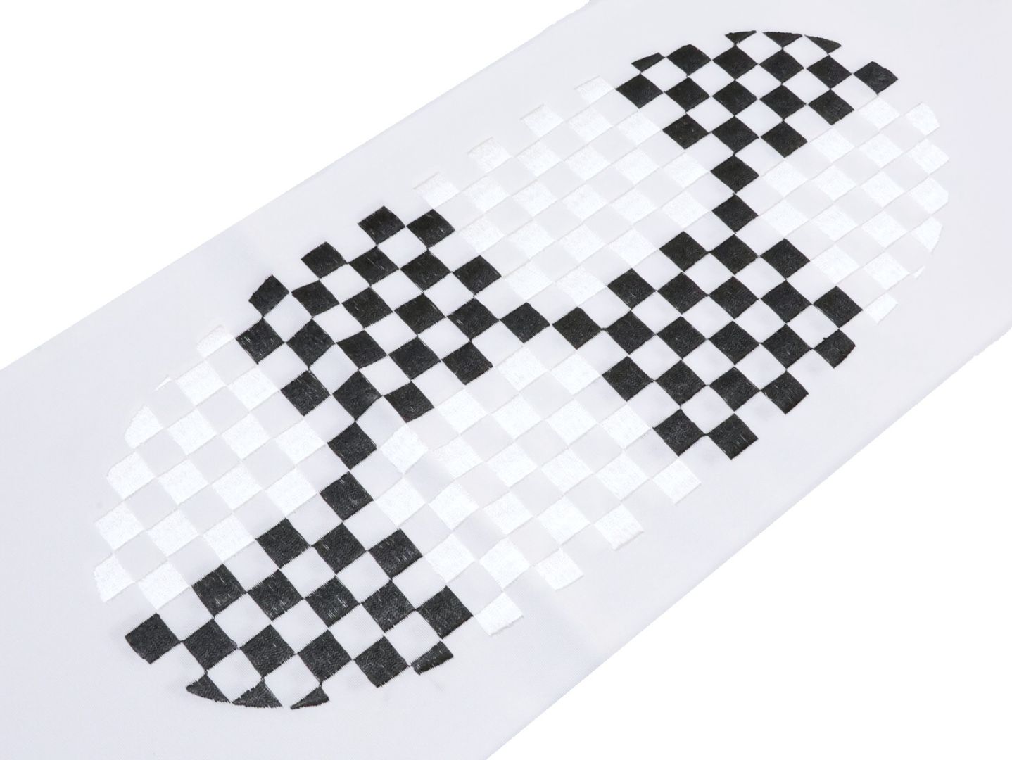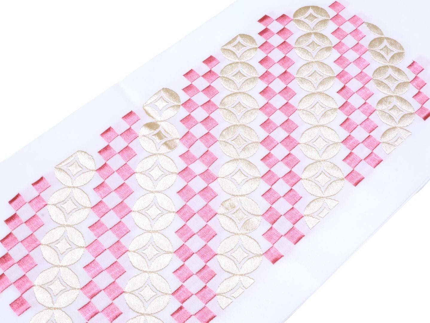 ・刺繍半衿「白色の地に濃いピンク色の市松と薄ベージュ色の七宝の刺繍」