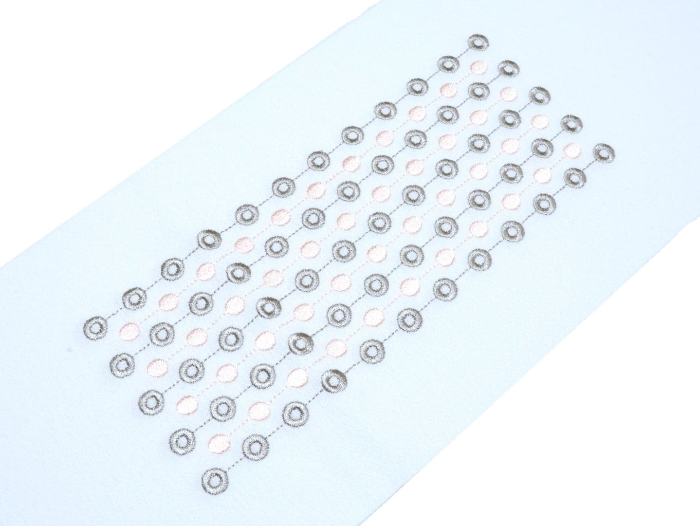 ・刺繍半衿「白色の地に濃いグレー色とピンク色のドット繋ぎ模様の刺繍」
