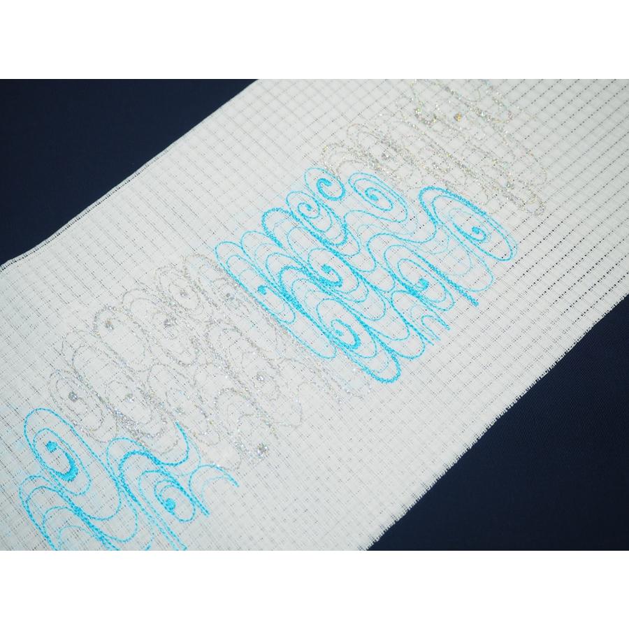 ・夏物刺繍半衿(格子絽)「白色の地に濃い水色と銀色の観世水の刺繍」