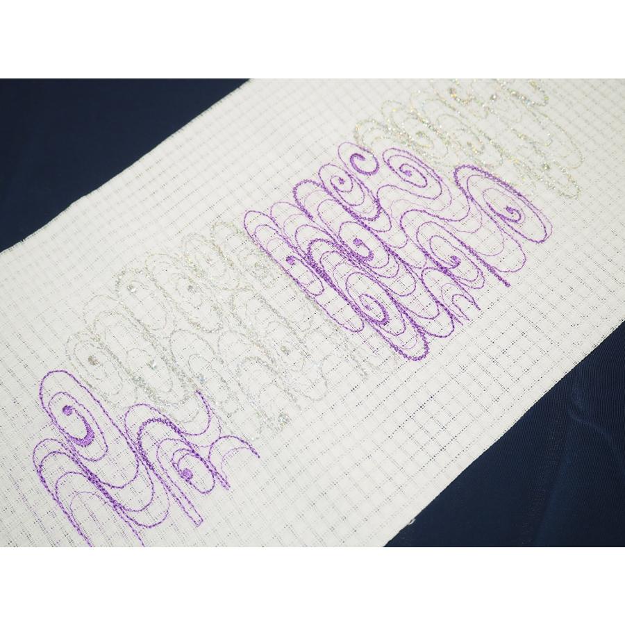 ・夏物刺繍半衿(格子絽)「白色の地に紫色と銀色の観世水の刺繍」