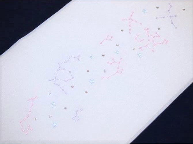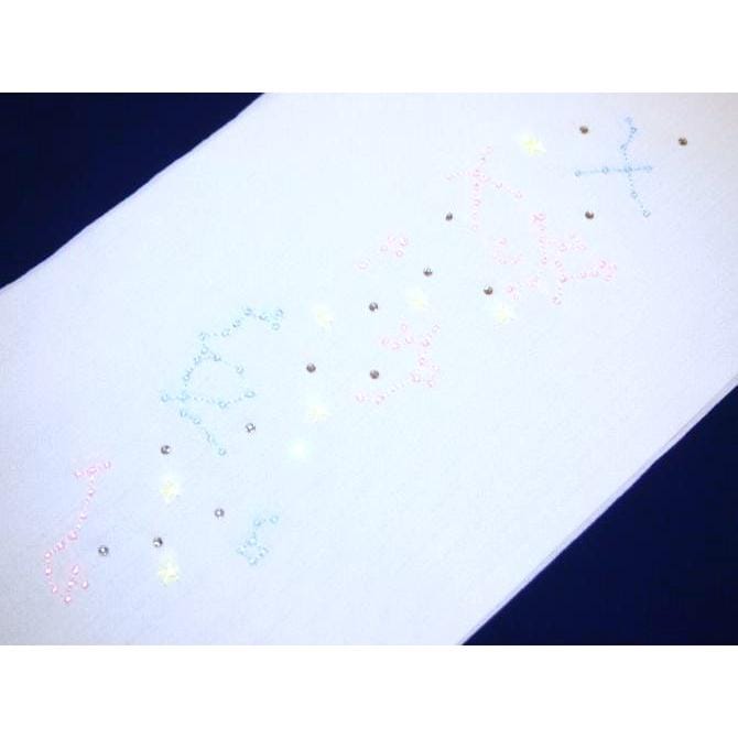 ・夏物刺繍半衿(縦絽)「白色の地にピンク色と水色の星座の刺繍とラインストーン」