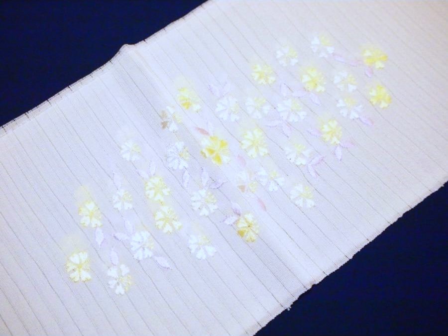 ・夏物刺繍半衿「白色の地に濃淡のクリーム色の桜と流水の刺繍」