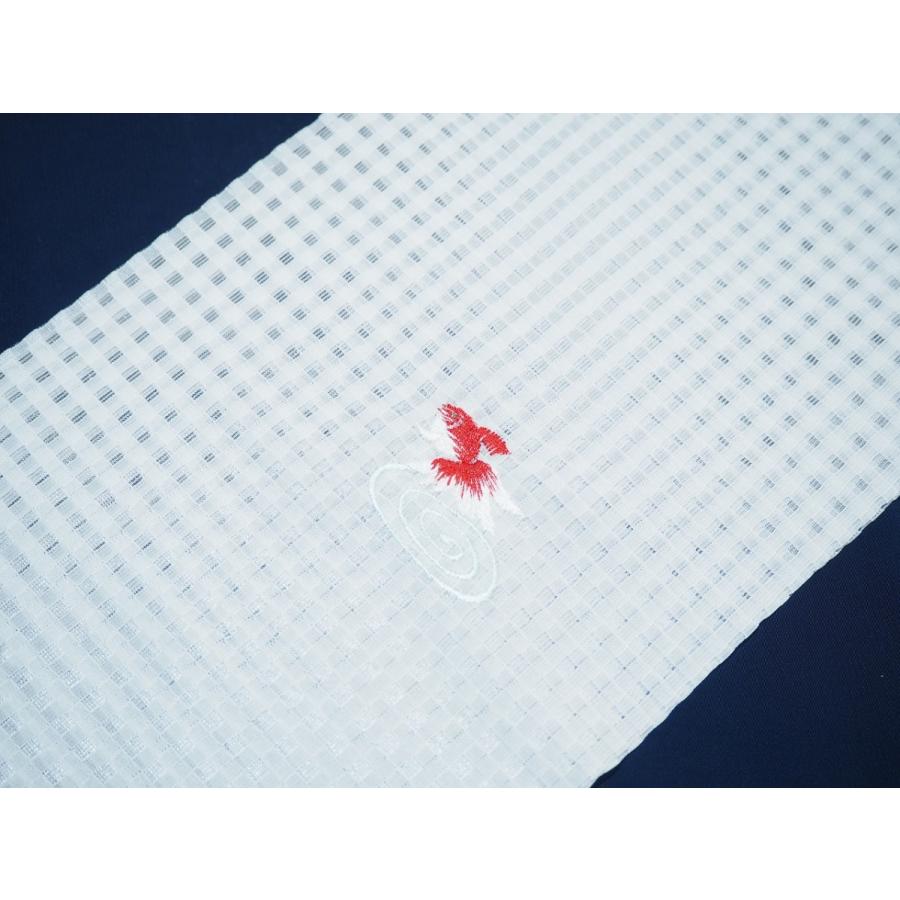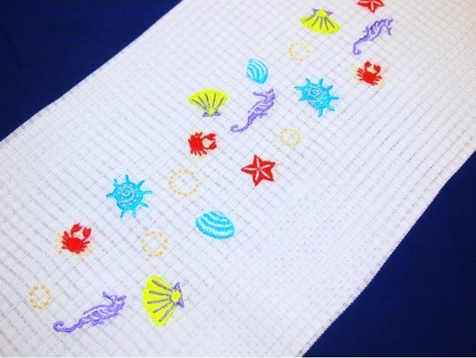 ・夏物刺繍半衿(格子絽)「白色の地にカニ、貝、タツノオトシゴ」