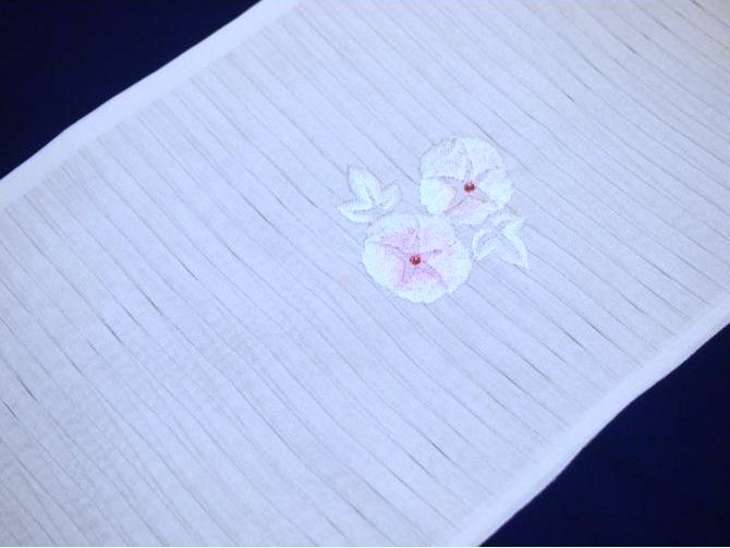 ・夏物刺繍半衿「白地に薄ピンク色の朝顔とラインストーン(爽竹生地使用)」