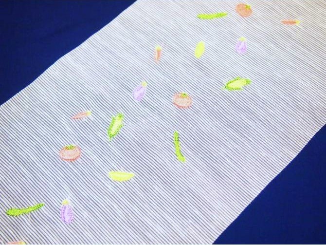 ・夏物刺繍半衿(絽)「あら朱色の地に白色と黄色のメダカの刺繍」
