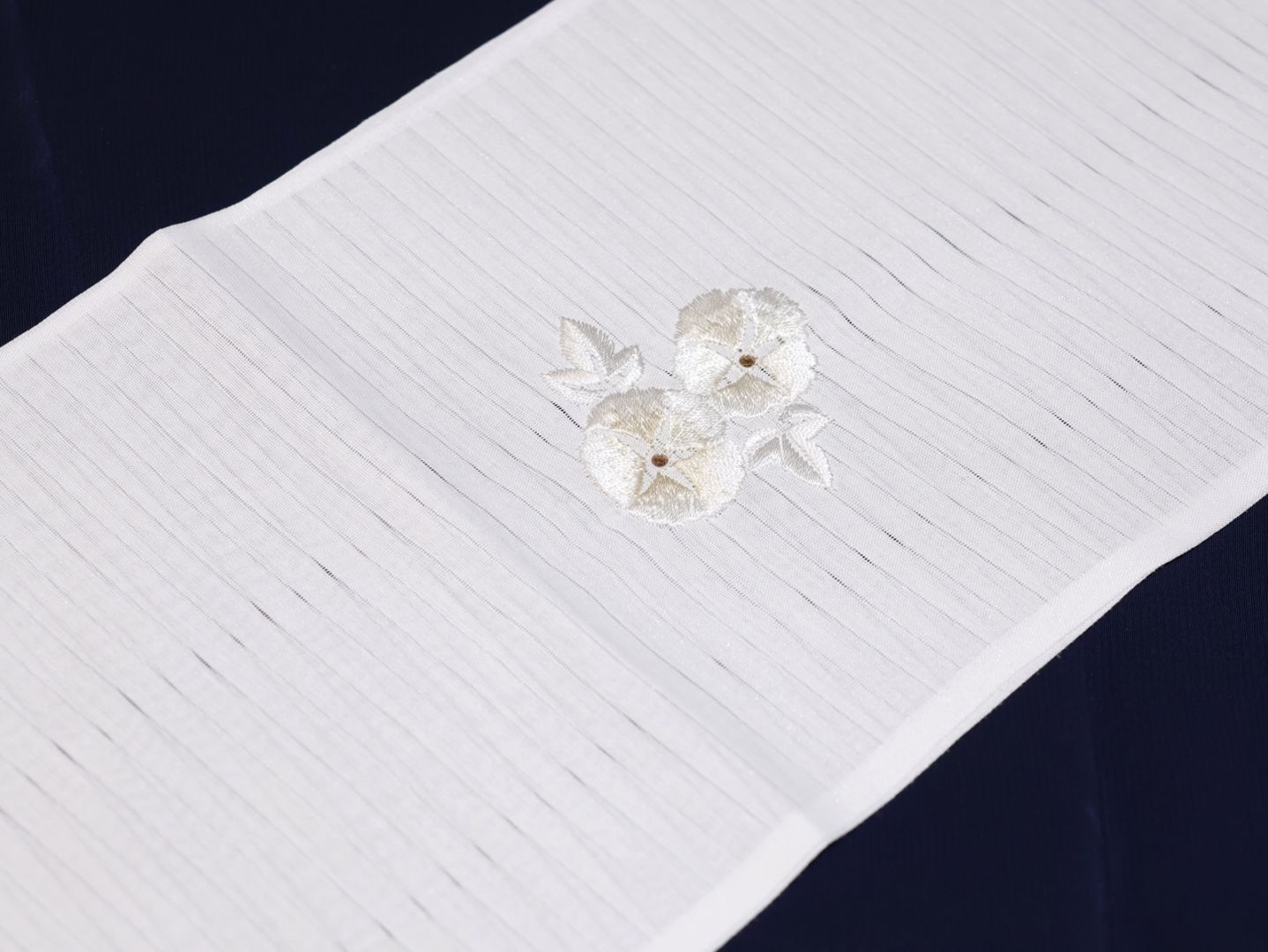 ・夏物刺繍半衿「白色の地に薄ベージュ色と白色の朝顔とラインストーン」