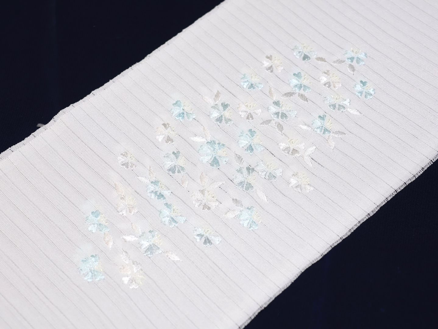 夏物本麻刺繍半衿「白色の地に灰緑色、灰水色、ブルーグレーの青海波刺繍」