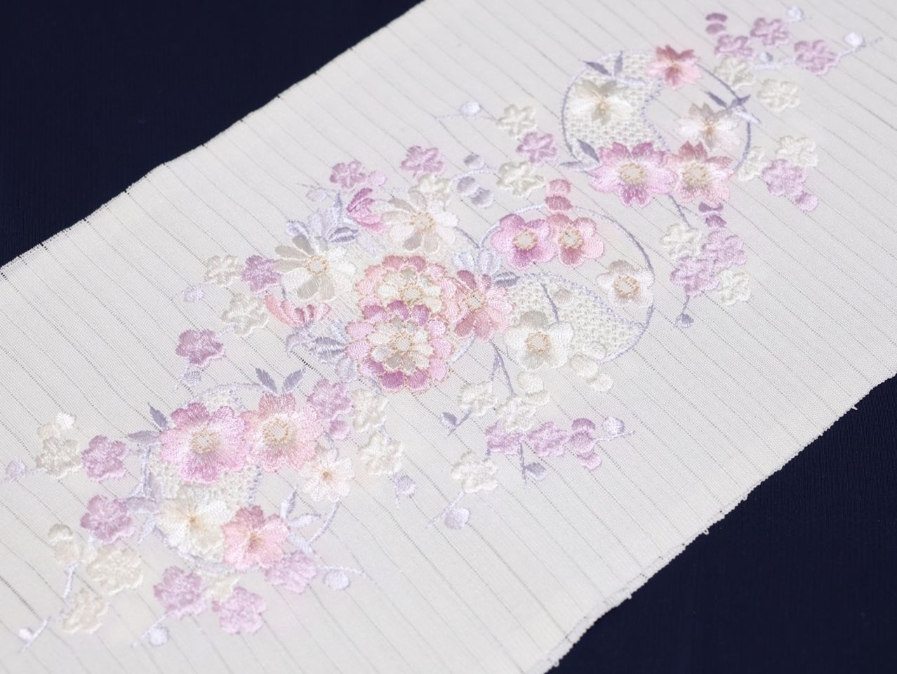 ・夏物刺繍半衿(絽)「白色の地に薄紫色とフジ色の梅、桜、菊の刺繍」