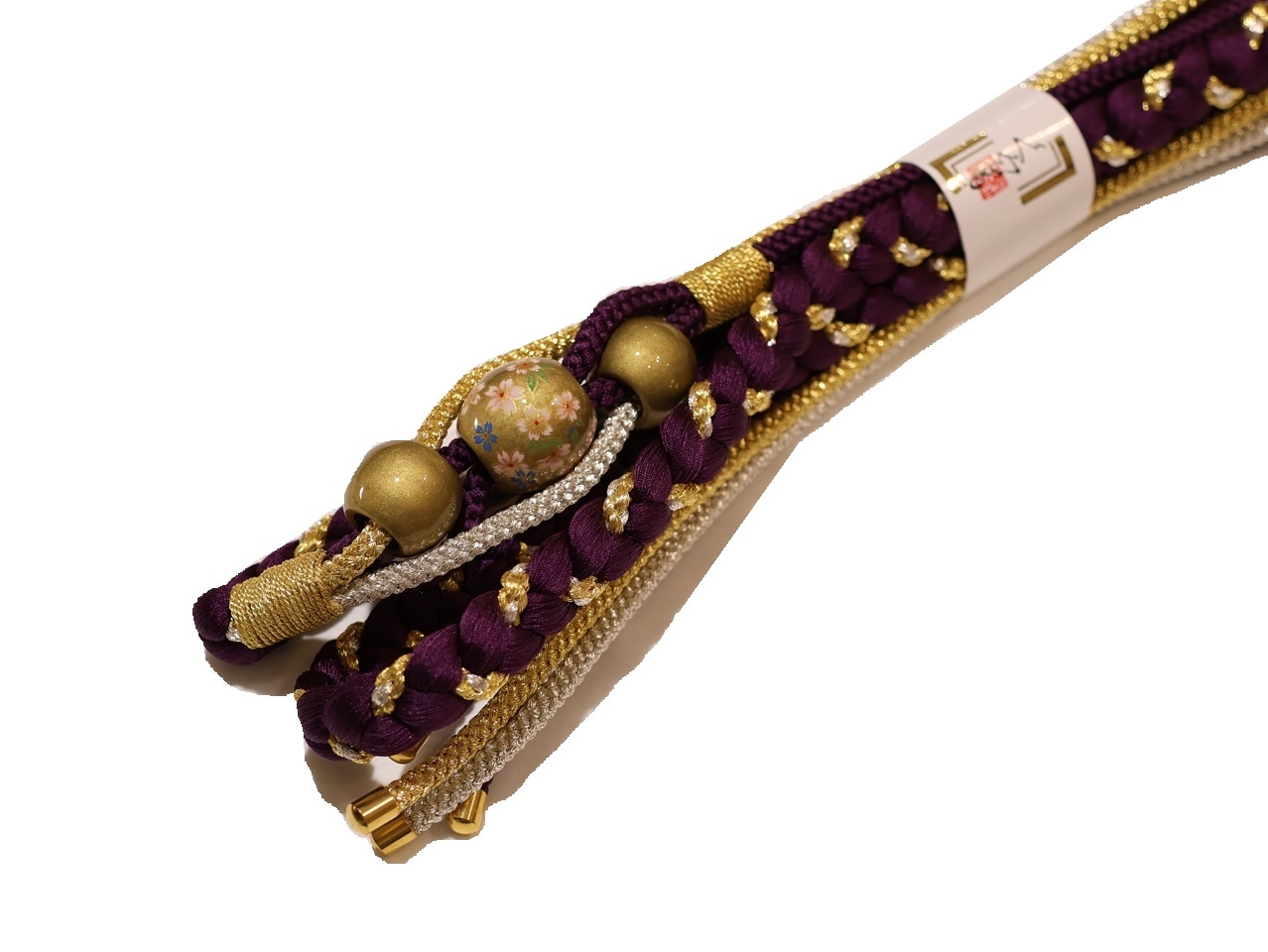 ・振袖用帯締め(四津組)「紫色の地に金糸とラクト玉の飾り」