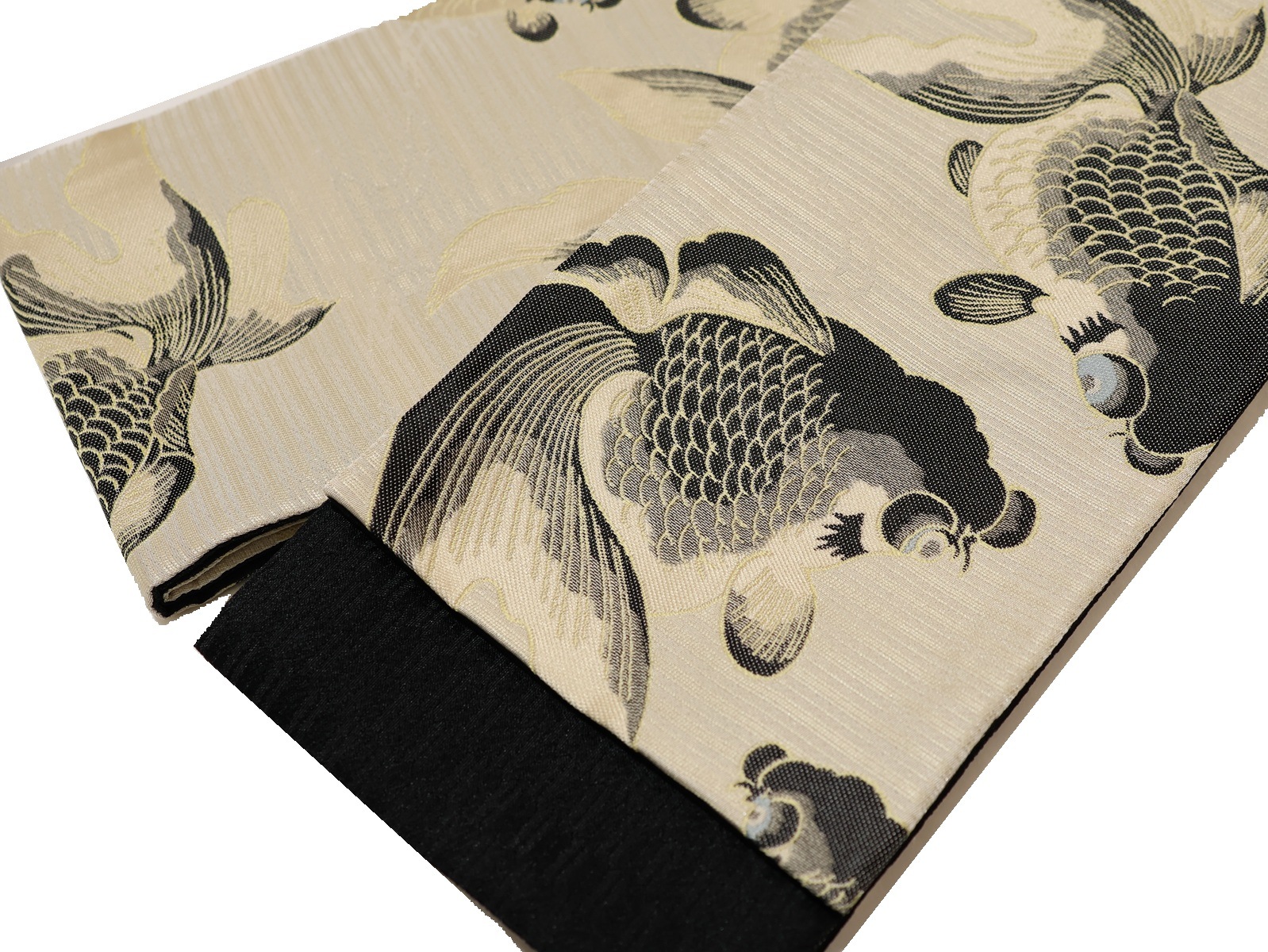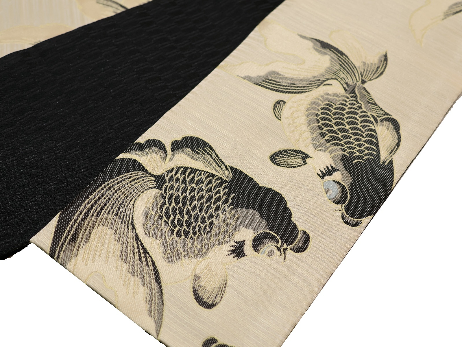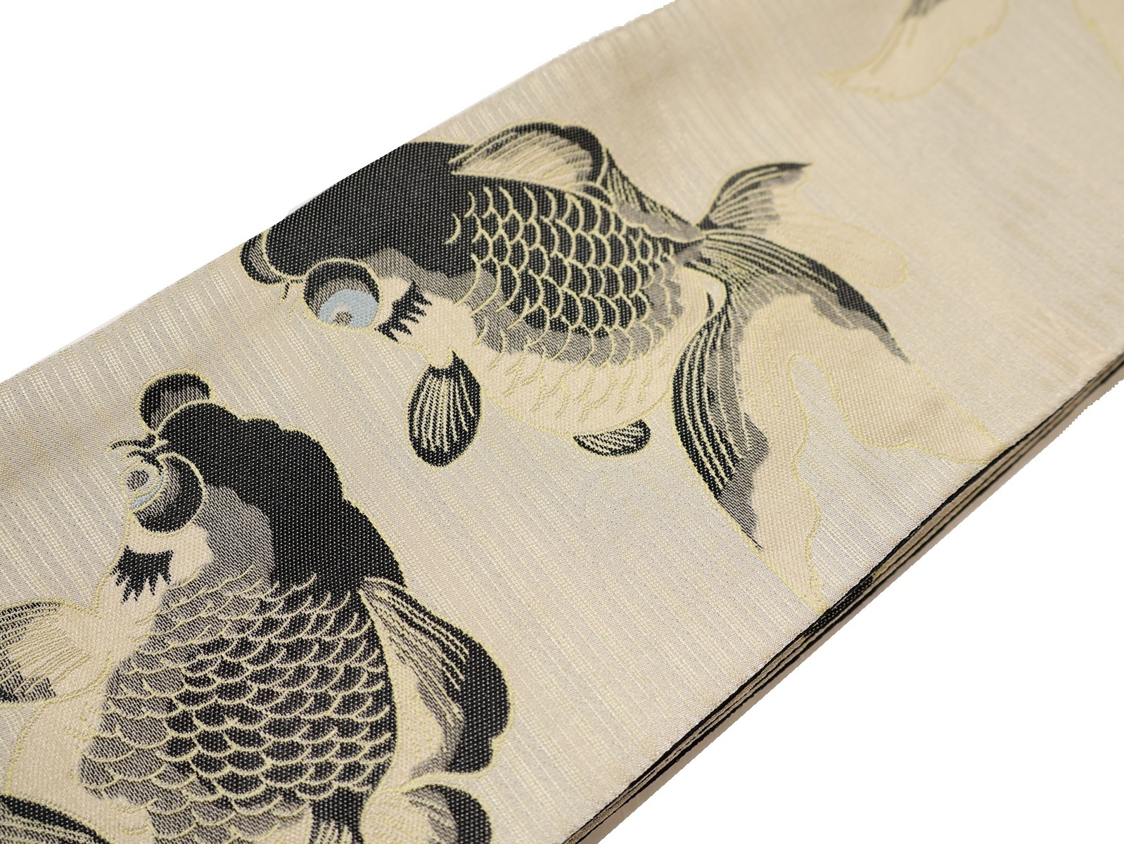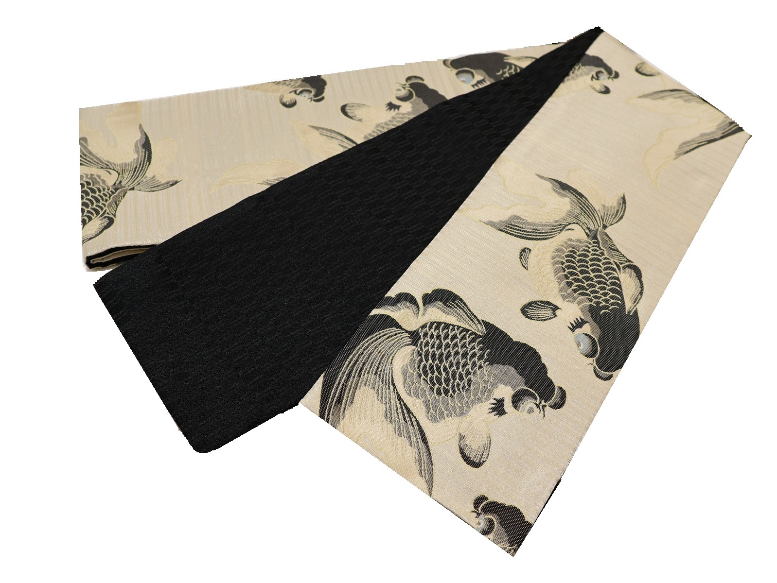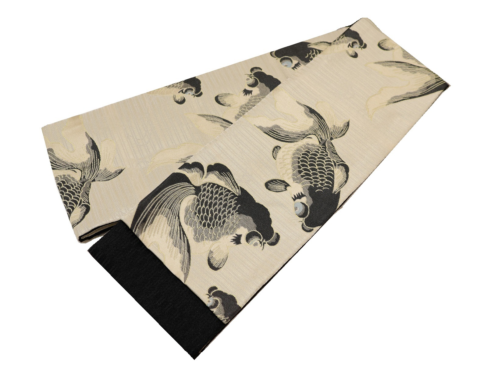 ポリエステル半幅帯「ベージュ色の地に黒色の出目金」