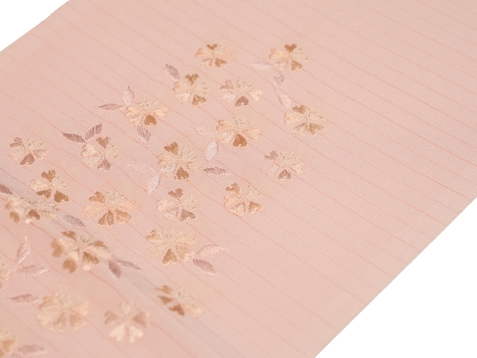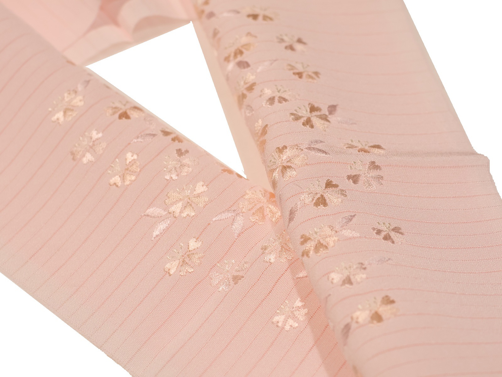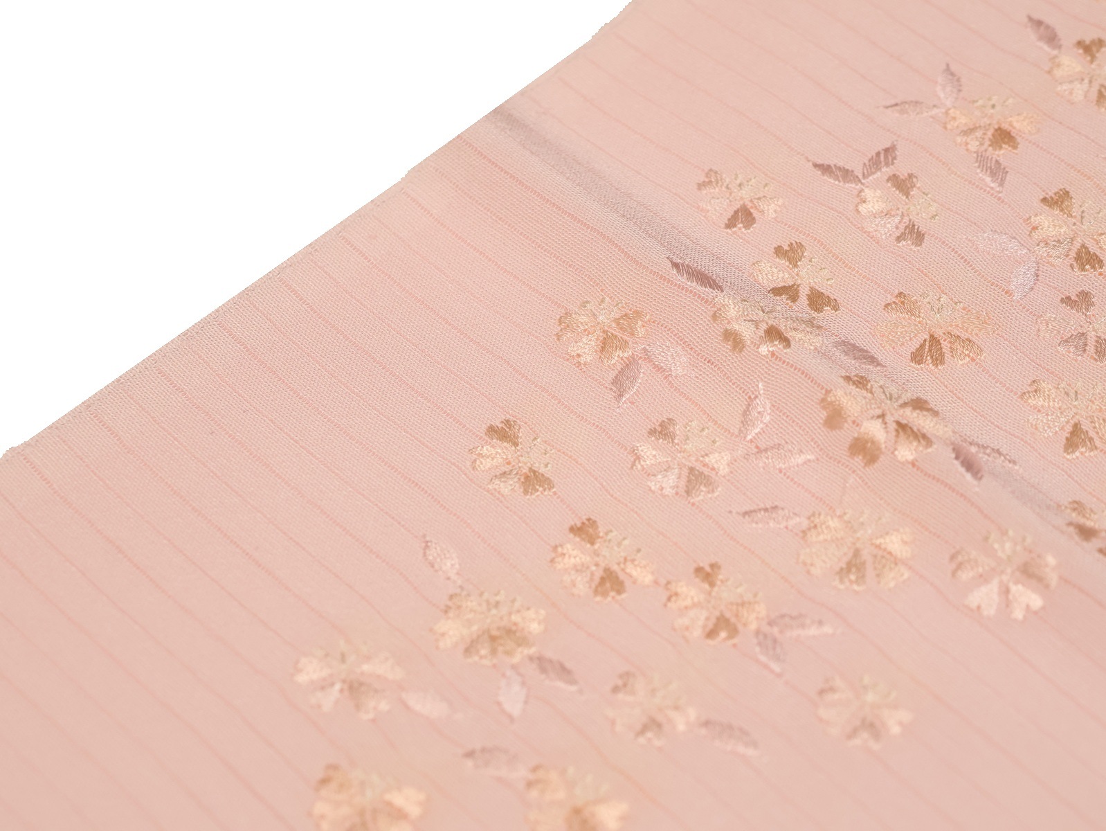 ピンク色の「絽」の地に薄ピンク色の花の刺繍が入ります。